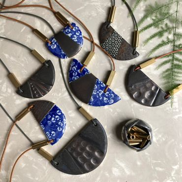 Turkish necklace brass clay ceramics handmade Linda Coss Earth & Twine clay small batch maker carved